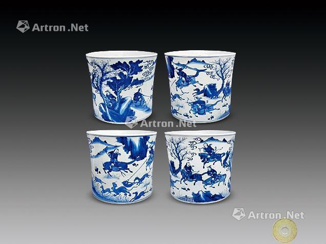 青花狩猎图大笔筒(清康熙)