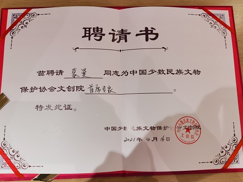 2021年9月,文创院特聘全国妇联副主席、《百家讲坛》讲师、文化名人蒙曼女士为中国少数民族文物保护协会文创院首席专家并向其颁发聘书。一直以来,文创院不光重视在艺术品领域专业性与权威性的建设,同时更加看重在厚植文化底蕴、坚守初心使命方面的坚持。蒙曼老师的加入让文创院在弘扬中国传统文化道路上行稳致远,笃定前行。